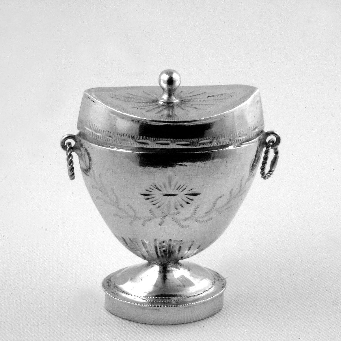 Kastanjevaasje gegraveerd met vederachtige guirlande en roset op deksel.