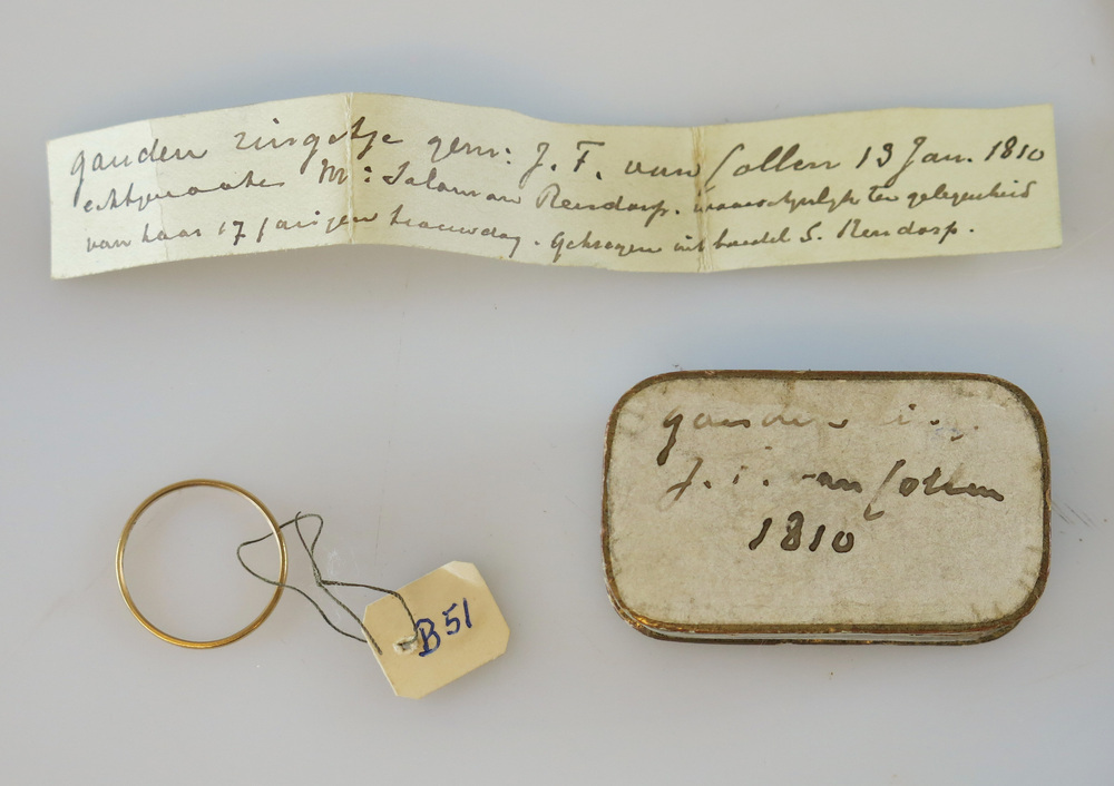 Volgens bijgevoegde notitie: "Gouden ringetje gem: J.F. van Collen 13 Jan. 1810/ echtgenoote M: Salom van Rensdorp, waarschijnlijk ter gelegenheid/ van haar 17 jarigen trouwdag. Gekregen uit boedel S. Rendorp."- Trefwoorden