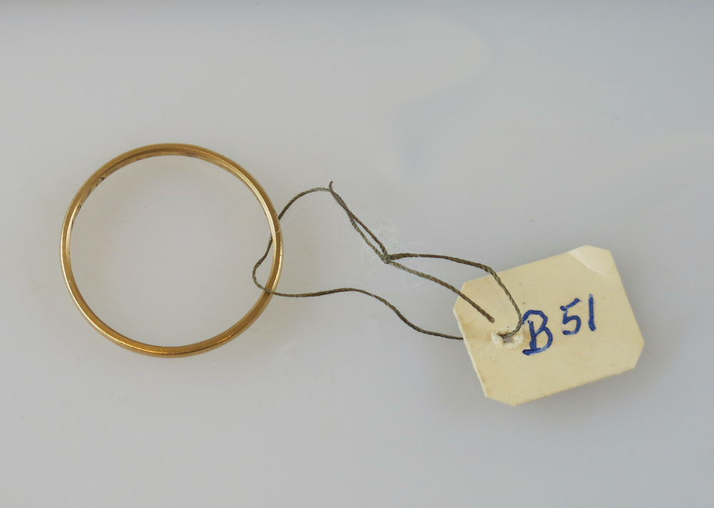 Volgens bijgevoegde notitie: "Gouden ringetje gem: J.F. van Collen 13 Jan. 1810/ echtgenoote M: Salom van Rensdorp, waarschijnlijk ter gelegenheid/ van haar 17 jarigen trouwdag. Gekregen uit boedel S. Rendorp." (N.B. volgens inscriptie was datum: 13 Jan. 1818)
