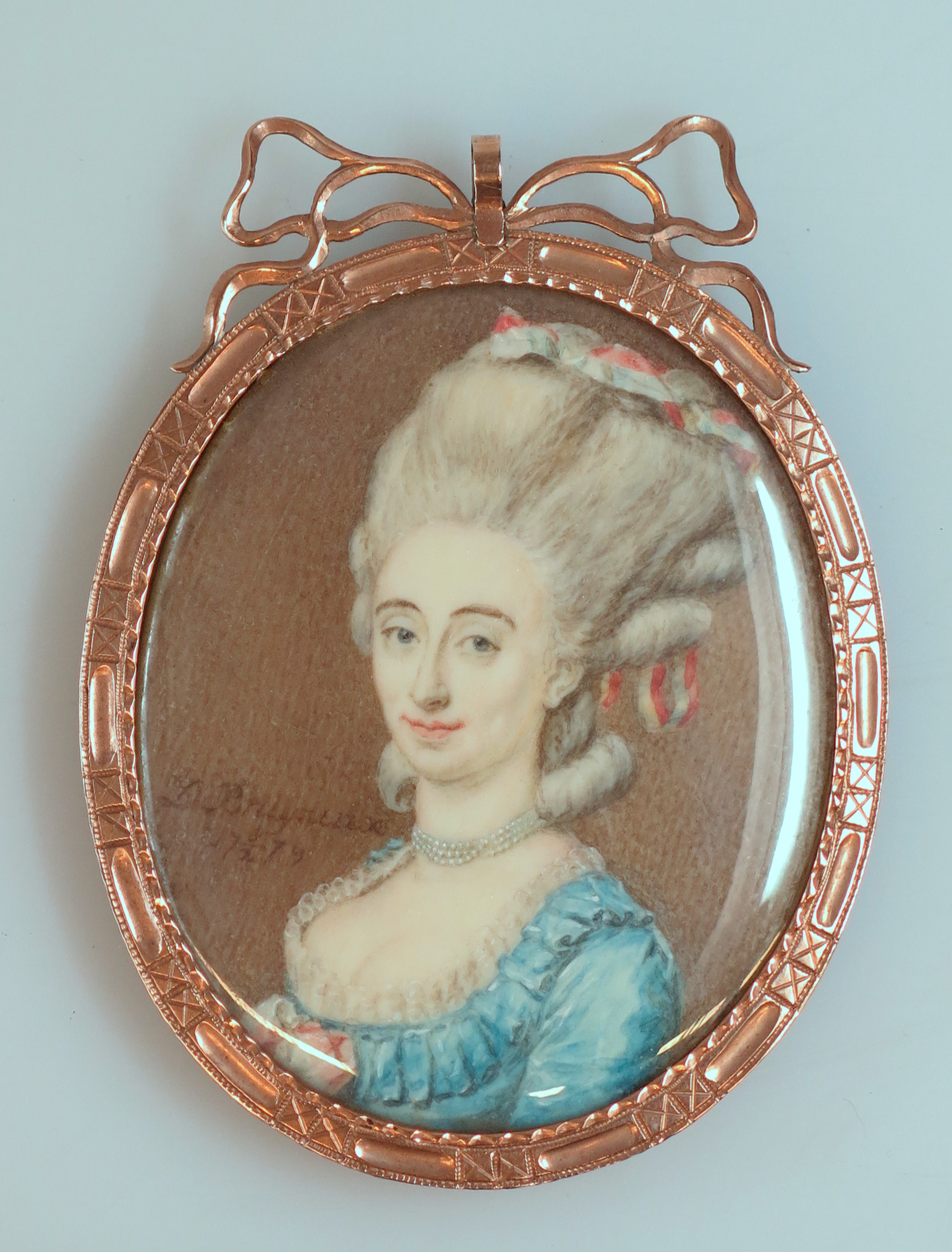 Dit medaillon van goud en ivoor toont een portret van een dame in achttiende-eeuwse uitdossing. Vermoedelijk gaat het hier om Adriana Susanna Tiewelen (1729-1781), echtgenote van Marten Adriaan Beels (1728-1789) en lid van de adel. Beels was advocaat en bewindhebber van de Vereenigde Oostindische Compagnie. Daarnaast werd hij in 1787 burgemeester van Amsterdam. Omdat hij tegen de patriottenbeweging gekant was, werd hij echter enkele maanden na zijn benoeming al van zijn functie vervallen verklaard. Het medaillon is in 1779 geschilderd, Adriana Susanna was toen vijftig jaar oud. Op het portret draagt ze een blauwe japon, afgezet met ruches en een rand van wit kant. In het gepoederde haar bevindt zich een oranjerood-wit lint. Wellicht dat de kleuren van het lint een verwijzing zijn naar de orangisten, wiens zijde de familie Beels koos in de strijd tegen de patriotten. Het medaillon wordt bewaard in een doosje van groen haaienleer.