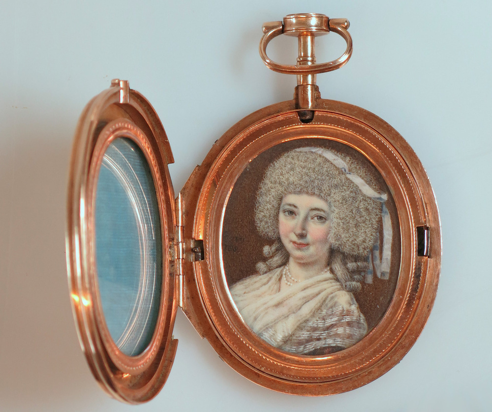 Dit medaillon van koper, goud en ivoor toont een portret van een dame in laat achttiende-eeuwse uitdossing. Vermoedelijk gaat het hier om Johanna Jacoba van Oosten de Bruyn (1768-1793), de jongste dochter van Gerrit Willem van Oosten de Bruyn (1727-1797) en Maria Croon (1729-1799), beide lid van de adel. Zij groeide op in hun woning aan de Grote Houtstraat te Haarlem en op buitenplaats Randenbroek in Amersfoort. Vader Gerrit was advocaat en werd tijdens de Patriottentijd benoemd tot burgemeester van Haarlem. Hij koos echter de kant van de orangisten en werd na het uitroepen van de Bataafse Republiek in 1795 afgezet.