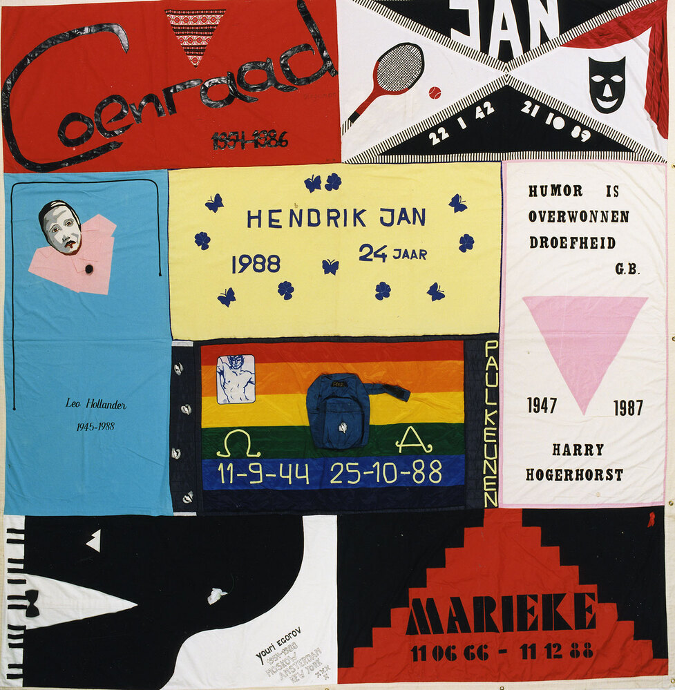 De eerste gevallen van aids werden begin jaren ’80 geconstateerd. Geïnspireerd door het Amerikaanse voorbeeld begonnen mensen in Nederland naamvlaggen voor de slachtoffers te maken. Deze naamvlaggen vormen samen quiltblokken, die gecombineerd een grote Aids Memorial Quilt maken. In 1988 vervaardigde Gart Zeebregts de eerste Nederlandse naamvlag, gewijd aan de in Amsterdam overleden Russische pianist Youri Egorov. Op de vrieskoude Wereldaidsdag in december 1988 presenteerden nabestaanden de eerste Nederlandse naamvlaggen op de Dam in Amsterdam. Begin jaren '90 groeide de Nederlandse Aids Memorial Quilt snel. Inmiddels zijn er 29 en een halve quiltblokken gemaakt voor ongeveer 350 mensen die zijn overleden aan aids. Dat is 8% van de grofweg 4500 Nederlandse aidsslachtoffers. De Nederlandse quiltblokken worden op het moment ondergebracht in verschillende musea, waaronder het Amsterdam Museum. ( Sarah Remmerts de Vries)
