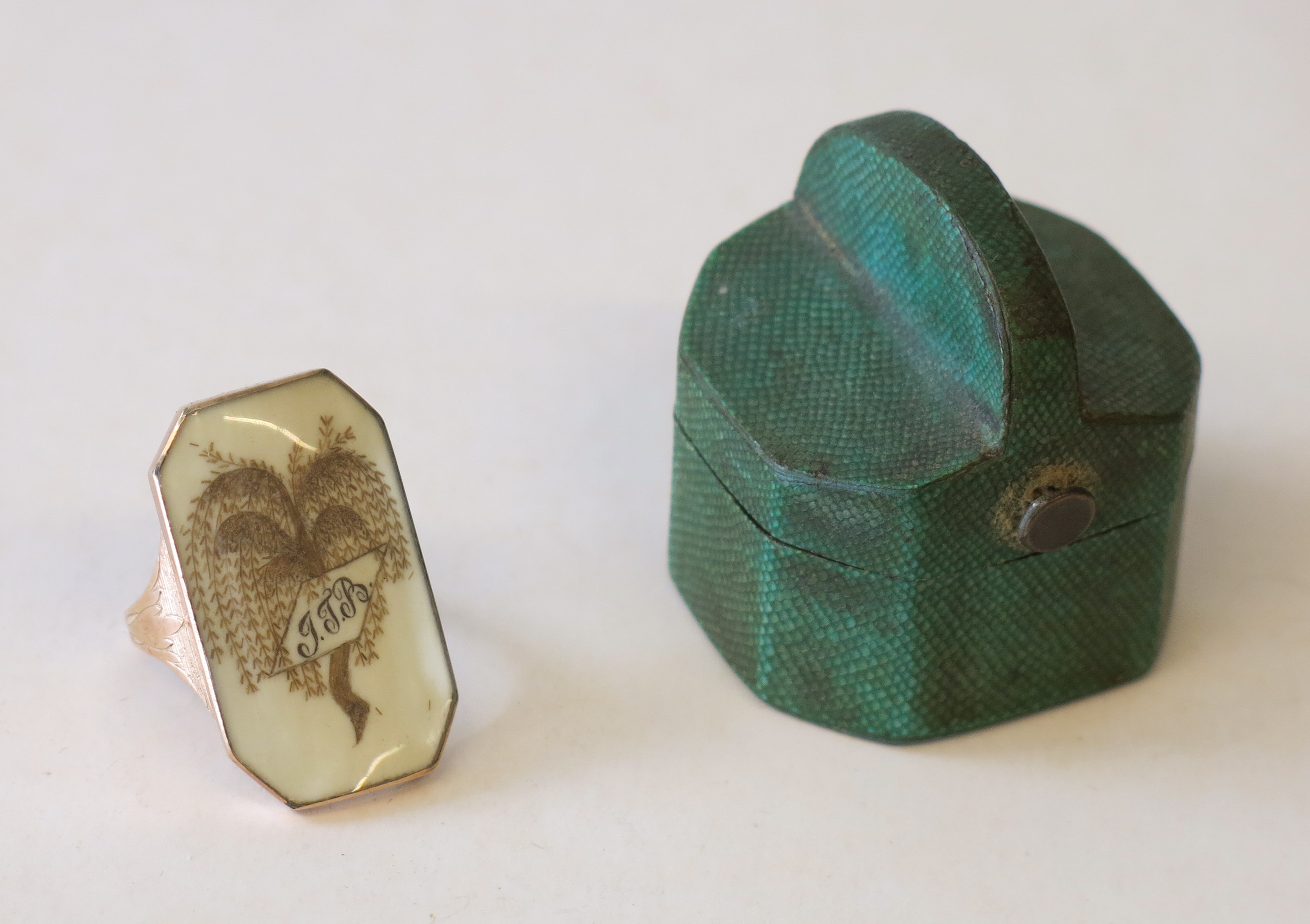 Deze gouden ring behoorde toe aan Jacob Tiewelen Beels (1767-1792), de jongste zoon van Marten Adriaan Beels (1728-1789) en Adriana Susanna Tiewelen (1729-1781), beide lid van de adel. Vader Marten was advocaat en bewindhebber van de Vereenigde Oostindische Compagnie. Daarnaast werd hij in 1787 burgemeester van Amsterdam. Omdat hij tegen de patriottenbeweging gekant was, werd hij echter enkele maanden na zijn benoeming al van zijn functie vervallen verklaard. Zoon Jacob was secretaris van de Directie der Oostersche Handel en Reederijen, een organisatie die sinds 1689 de belangen behartigde van reders en handelaren in het Oostzeegebied. Hier werd onder meer graan verhandeld. Van Jacobs moeder, oudere broer Leonard en diens vrouw bevinden zich tevens portretmedaillons in de collectie van het Amsterdam Museum (objectnrs. 3701.1/2, 3702.1/2 en 3703). ( Sarah Remmerts de Vries)