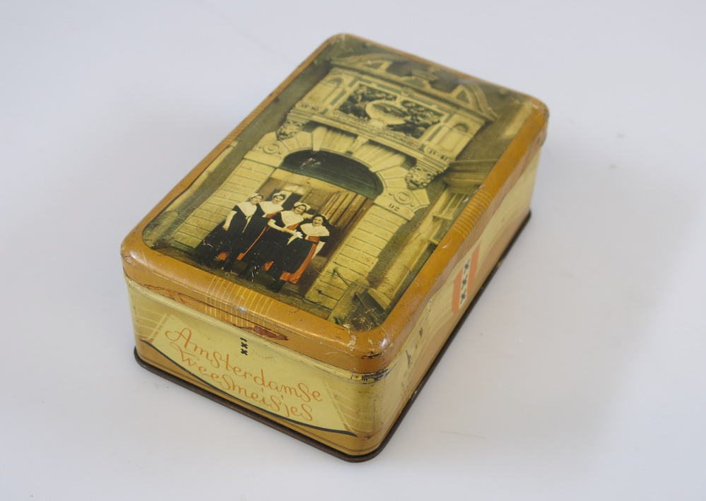 In het Amsterdamse Burgerweeshuis konden kinderen van Amsterdamse poorters (burgers met rechten om in de stad te wonen) terecht, die geen ouders of een moeilijke thuissituatie hadden. Weesjongens en –meisjes leefden in het weeshuis veelal een gescheiden bestaan. Ze hadden aparte gebouwen met slaapzalen en zelfs aparte binnenplaatsen om te zitten en spelen. Terwijl de oudere jongens overdag buiten de deur een ambacht leerden, bleven de grote meisjes binnen, waar ze opgeleid werden tot nette huisvrouw. Ze leerden breien en naaien, en moesten tussen hun zestiende en achttiende jaar helpen in de huishouding. Daarna keerden ze terug naar het naaiatelier, waar ze soms opdrachten ontvingen van deftige Amsterdamse dames. Op de deksel van dit blikje zijn een aantal van deze weesmeisjes afgebeeld. Het blikje is afkomstig van banketbakkerij Lensen, die aan de Kalverstraat 94 gevestigd was. ( Sarah Remmerts de Vries)