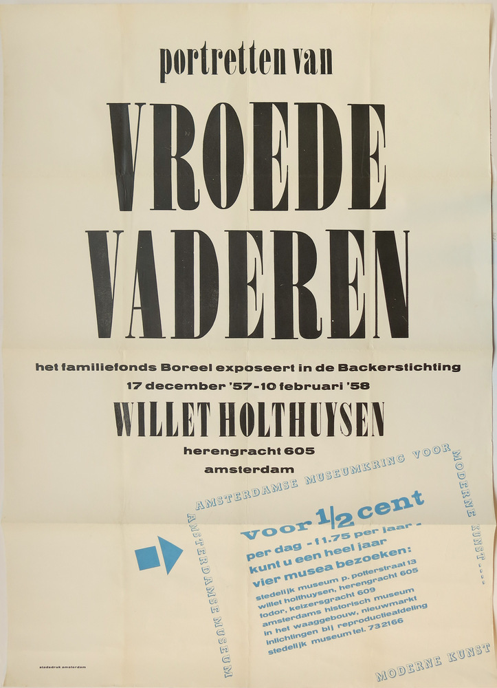 Affiche voor de tentoonstelling 'Portretten van Vroede Vaderen. Het familiefonds Boreel exposeert in de Backerstichting', die van 17 december 1957 tot en met 10 februari 1958 in Museum Willet-Holthuysen te zien was. Het affiche toont in simpele zwarte letters op een witte achtergrond de titel, data en locatie van de tentoonstelling. Het is ontworpen door Willem Sandberg, die van 1945 tot 1963 directeur was van de stedelijke musea van Amsterdam. Voor veel tentoonstellingen die destijds gehouden werden, ontwierp Sandberg zelf in de avonduren de affiches en catalogi. ( Sarah Remmerts de Vries)
