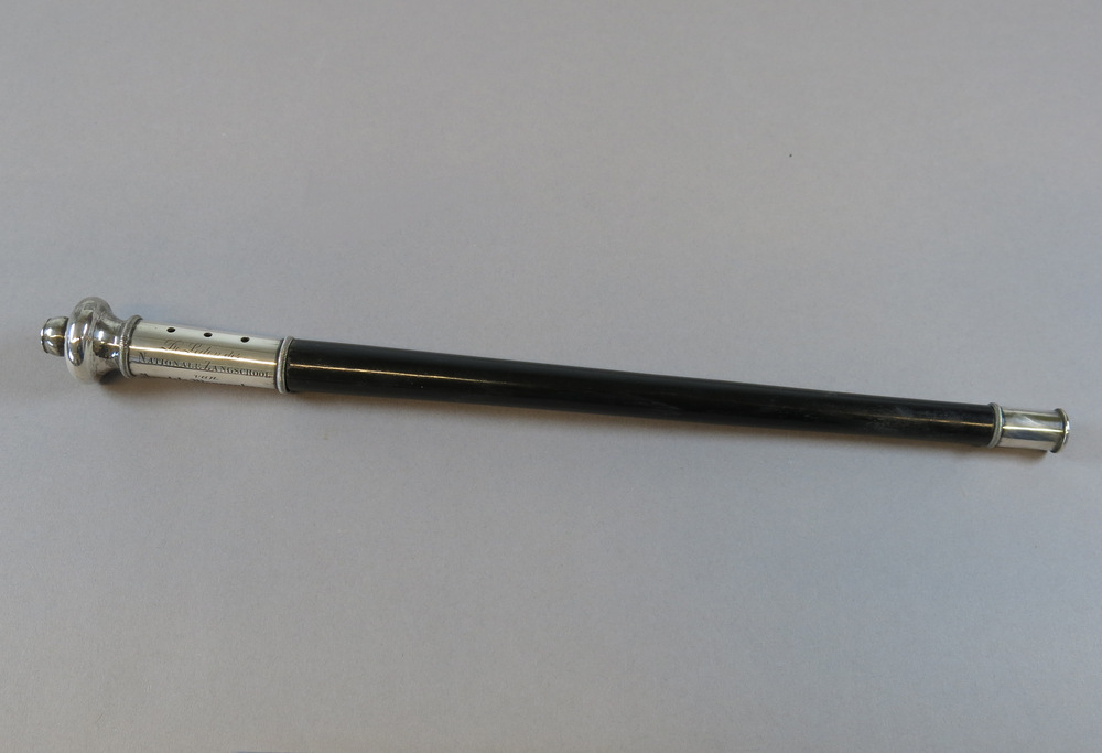 Dirigeerstok met stemfluit, aangeboden door leden der Nationale Zangschool van het Amstels Mannenkoor, afdeling Vrouwen en Meisjes, aan directeur Bern. J. Beumer, 1881