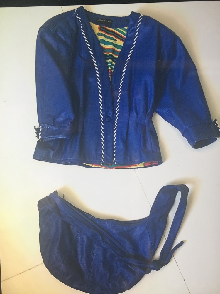 Jas van blauw leer, gevoerd met felgekleurde zijde. Kort, kraagloos model. Op de twee voorpanden, parallel aan de opening, zijn vanaf schouder tot zoom gaatjes gemaakt. Hierdoor is een wit leren bandje in diagonale strepen geregen. De driekwarts-mouwen hebben een brede, in een punt uitlopende manchet met split die omgeslagen is. Door gaatjes langs de rand van de split is een witte katoenen veter geregen. De jas is getailleerd door middel van zes ingestikte korte plooien op de voorpanden en twee korte plooien op ieder van de twee zijpanden. Het achterpand bestaat uit twee delen, en is eveneens op taillehoogte ingenomen door middel van acht korte plooien. Brede schoudervullingen aan de binnenzijde. Voering van zijde in hoofdzakelijk fel geel, met diagonale banen in rood, zwart, groen, lichtblauw en wit, en dunne verticaal lopende zwarte strepen. De jas sluit middenvoor op taillehoogte door middel van een met blauw leer beklede metalen drukknoop.