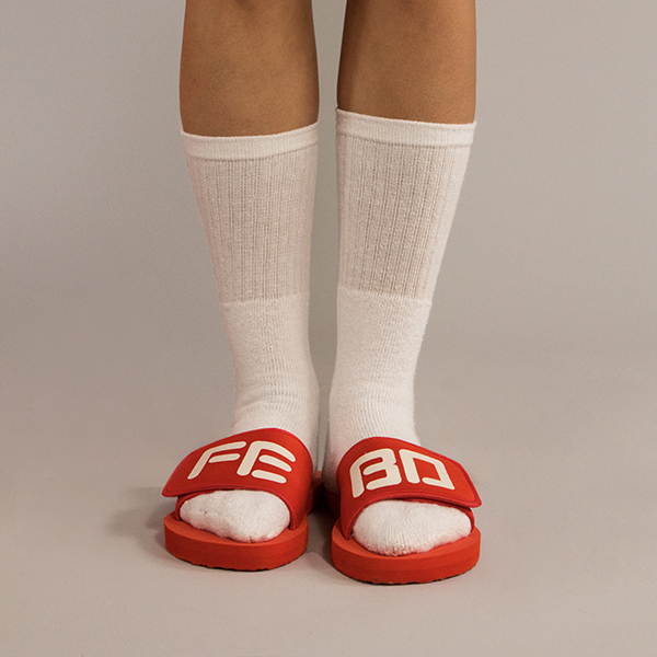 Slipper (rechts) van rode stof en kunststof, bovenop bedrukt met de letters 'FE' (van FEBO). Sluiting met rood klittenband op de wreef.