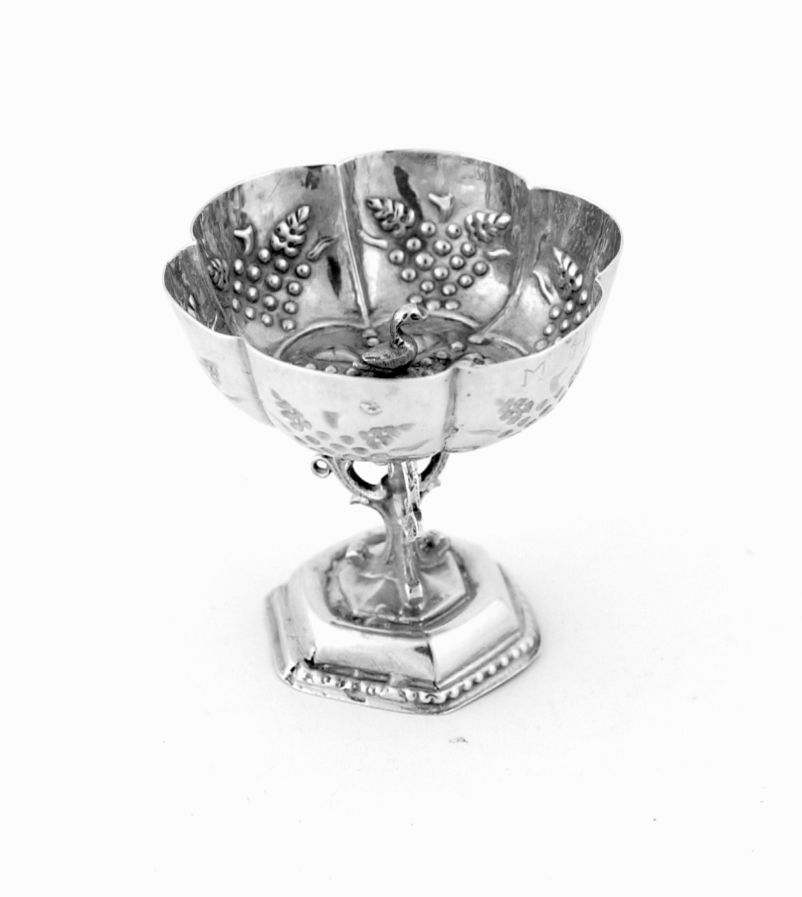 Verhoogde zeskantige voet met een parelrand, opengewerkte stam met drinkschaal.