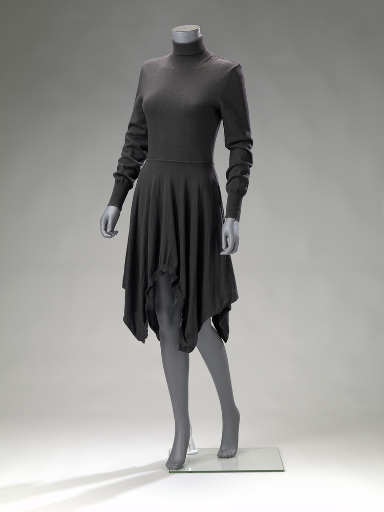 Jurk van zwart wollen tricot met strakke col. Hooggesloten model met col, middenachter op de rug een ophanglus. De jurk heeft lange mouwen met aangebreide boord. Het lijfje is nauwsluitend. Aan de taille is een wijd uitlopende rok genaaid, uitlopend in vier punten. Langs een gedeelte van de zoom, aan de voor en achterzijde, is een geribbelde tricot boord gebreid.