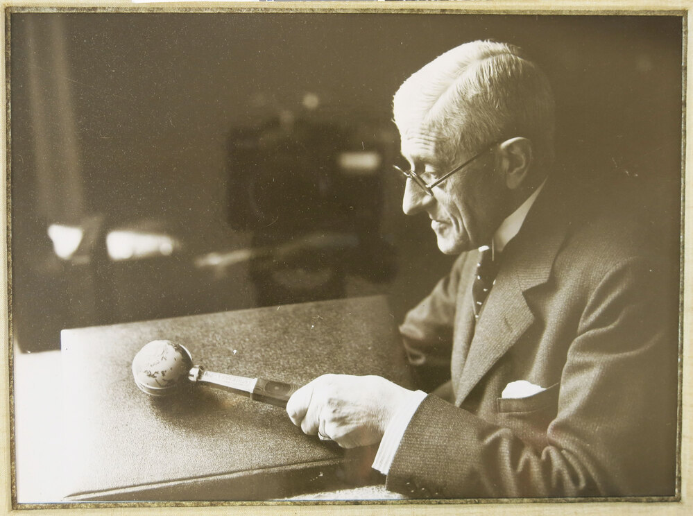 - Foto in lijst van Carl Bonebakker met het ontwerp van de voorzittershamer, die hij in 1932 ter opening van de Ontwapeningsconferentie aan de Volkenbond schonk, 1932
