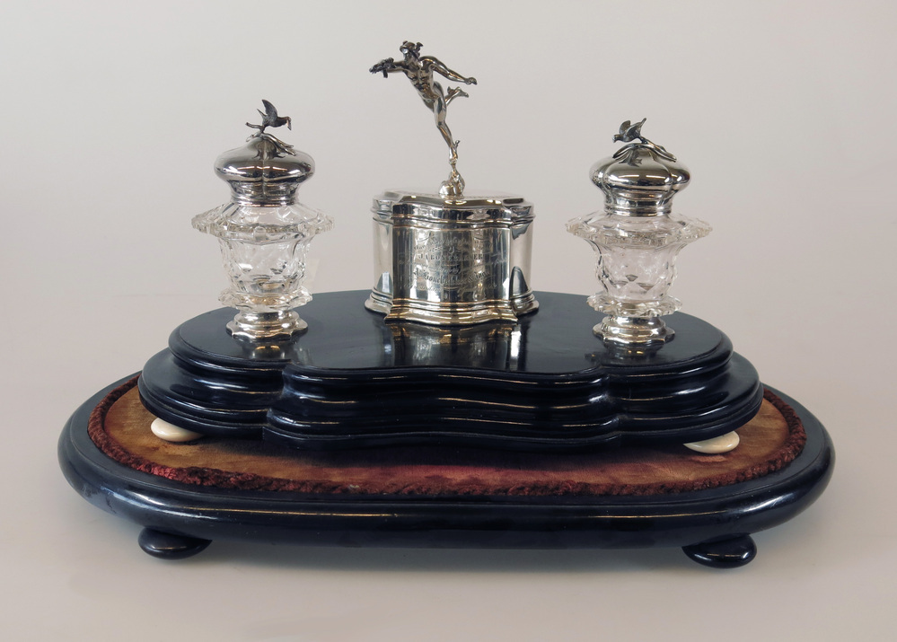 (.1) Niervormig plateau op vier schijfvormige, benen pootjes. Middenachter op plateau gemonteerde pot met (los) deksel; op deksel staat Mercurius-figuur. Links en rechts van pot staan (.2 en .3) glazen inktpotjes met zilveren doppen; op deze doppen staan duiven - de linkerduif heeft brief vast in snavel. (.4) Geheel staat op ovaal plateau op vier schijfvormige pootjes.