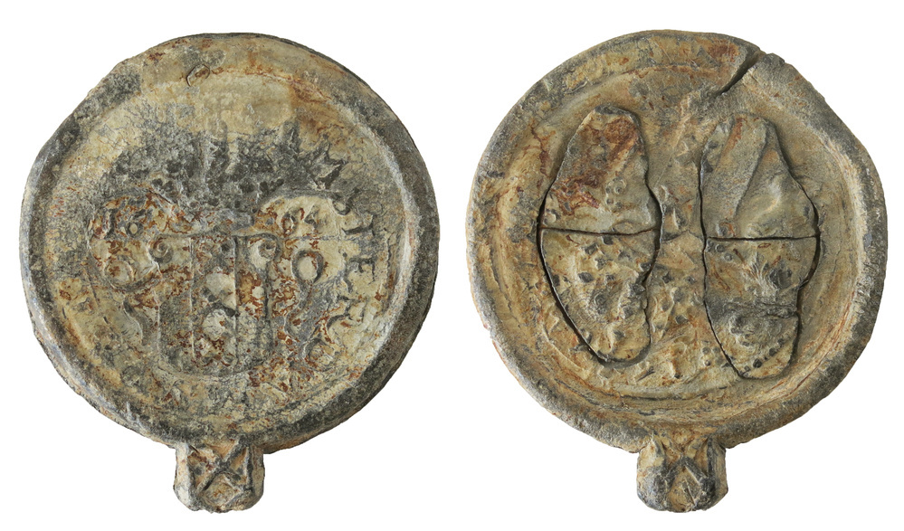 opdruk keerzijde: 1664: stadswapen gehouden door leeuwen en jaartal