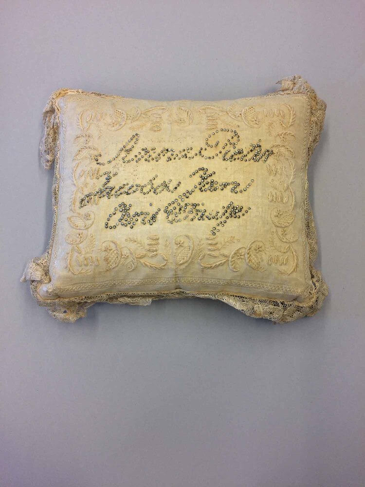 Speldenkussen, strakgevuld en gemaakt van geglansd ivoorkleurig katoen. Daaroverheen zit een zeer losgeweven ivoorkleurig katoen, waar rondom een rand van open-naaiwerk is geborduurd. Daarbinnen een rand met floraalmotief in Frans borduurwerk. In het midden is met kopspelden de volgende namen uitgebeeld: