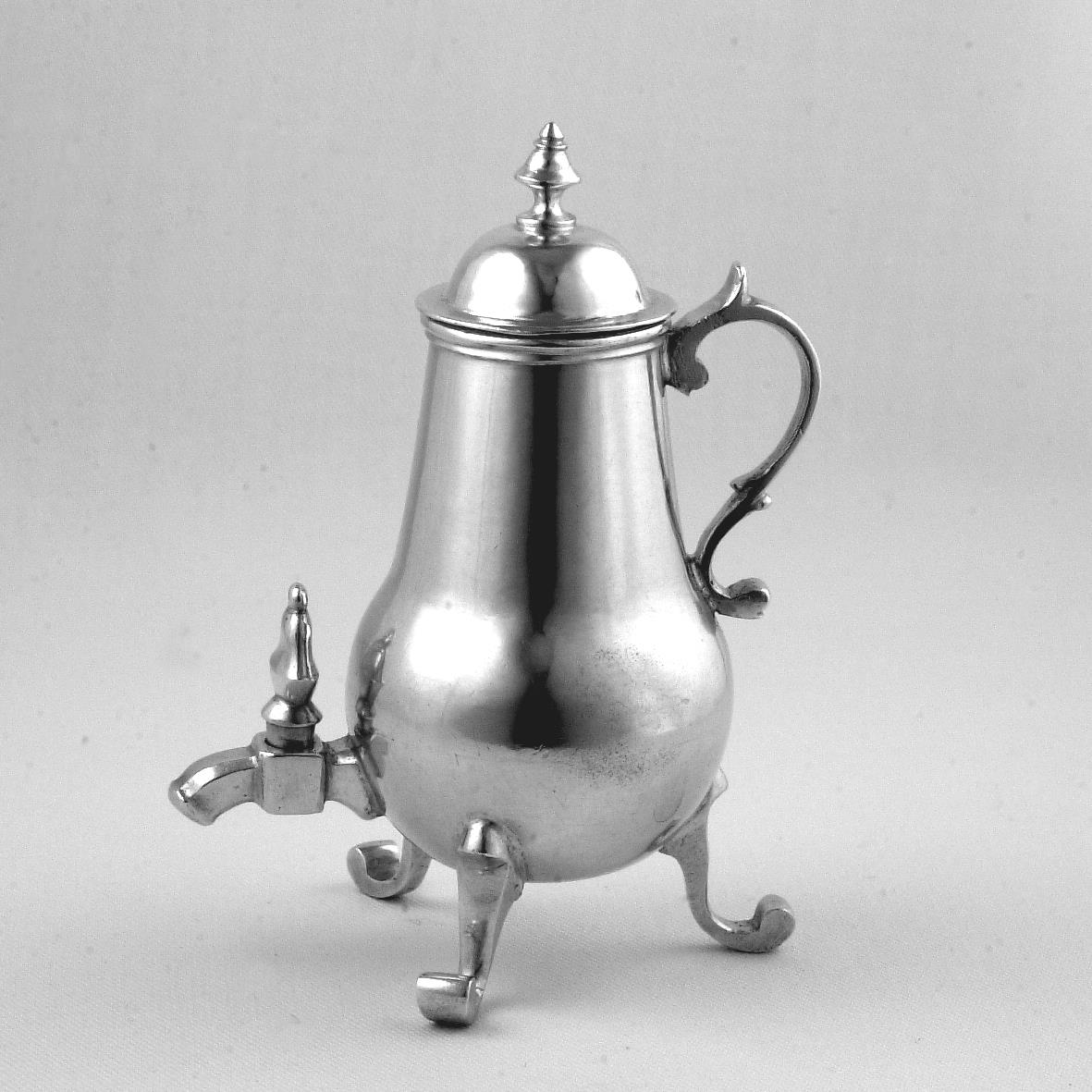Kan op drie pootjes met S-vormig oor; losse tap met vaasvormige knop, gewelfd deksel met knopje.
