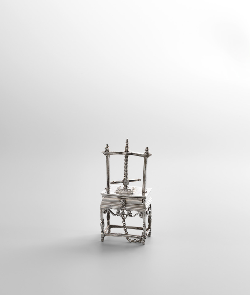 Een houten linnenpers was een onmisbaar hulpmiddel om tafelkleden, lakens en servetten na het mangelen en strijken extra glad te persen. Pas daarna ging het textiel, keurig opgevouwen en met een lintje eromheen, in de kast. Deze miniatuur pers van een onbekende, mogelijk Amsterdamse, zilversmid geeft een beeld van zo’n imposant meubel. Het bovenstuk bestaat uit een spil met een grove schroefdraad waarmee het linnen tussen de persplaten werd platgedrukt. Het kettinkje aan de lade is een latere toevoeging. ( Bert Vreeken)