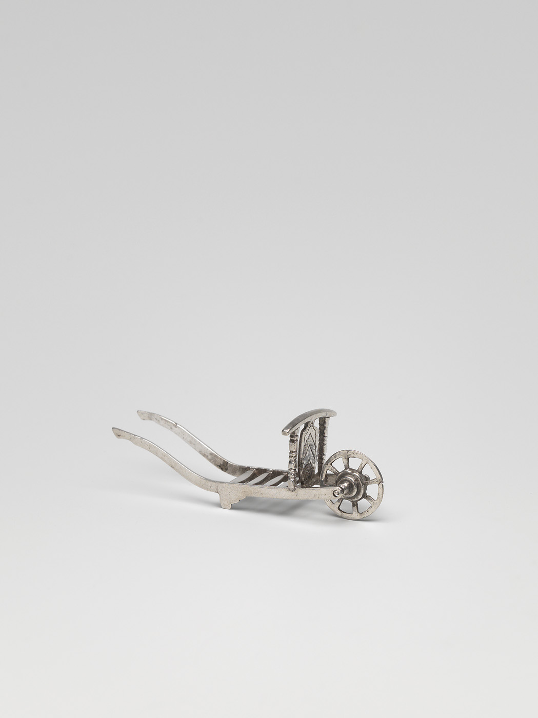 Houten kruiwagens waren een onmisbaar transportmiddel in de stad en op het platteland. Ze kwamen in verschillende types voor. Deze zilveren miniatuur is een lattenkruiwagen, gebruikt voor losse lading als reisbagage, kisten en zakken. Een ander type was de bakkruiwagen waarmee groente werd vervoerd, veelal door vrouwen. Sommige kruiwagens waren uitgebouwd tot een complete werkplaats of marktkraam op wielen, zoals de kar van een scharensliep die door de stad rondging om scharen en messen te slijpen. ( Bert Vreeken)