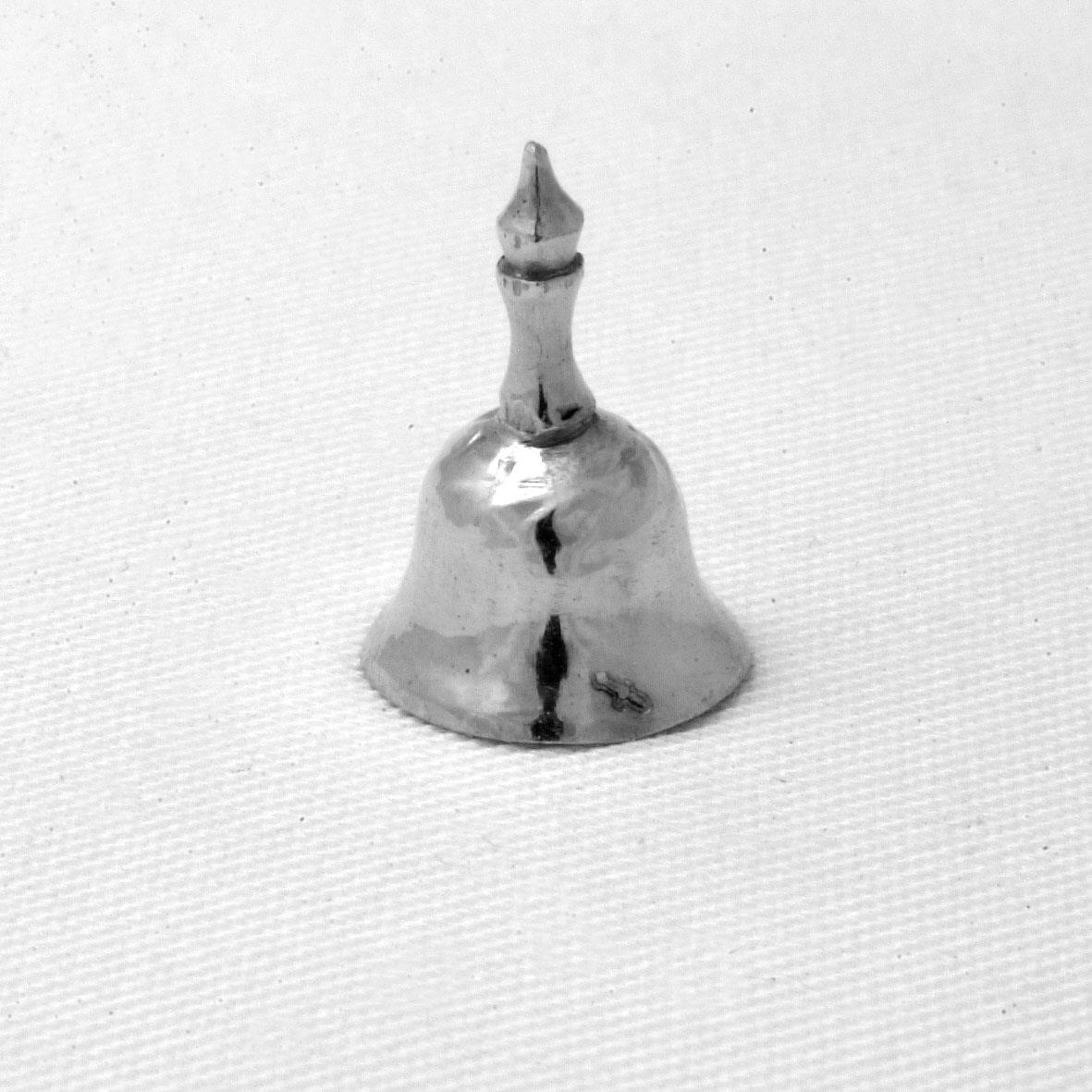 Zeer klein tafelbelletje met klepel, klokvormig lichaam met geprofileerde ronde steel en bekroond met een spits knopje; bovenzijde van de bel heeft een ingestampt ribbelmotief.- Trefwoorden