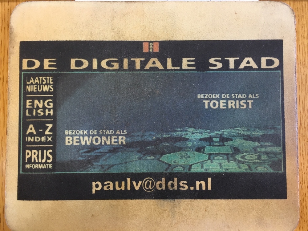 - Muismat met een afbeelding van de homepage van de Digitale stad in de jaren 90. Onderaan staat het mailadres van DDS bewoner Paul Vogel. ( Tjarda de Haan)