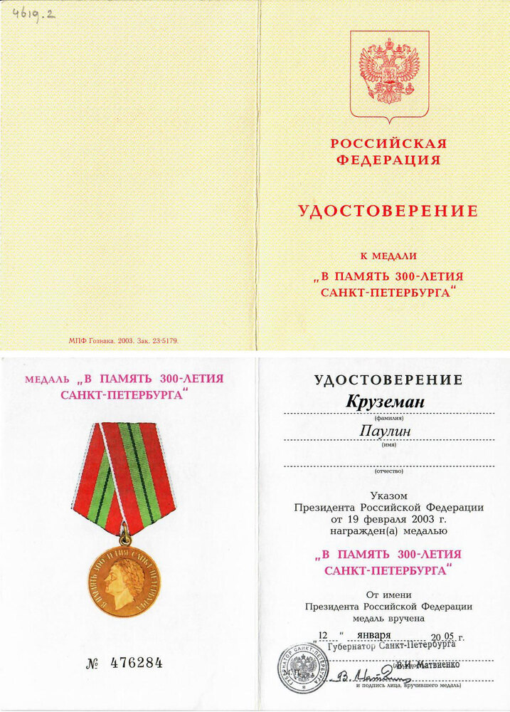 Certificaat bij medaille 300 jaar Sint-Petersburg