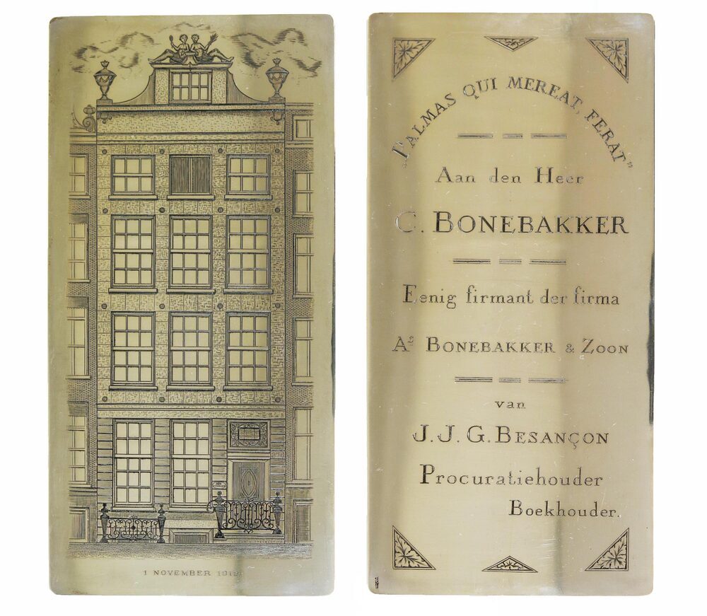- Plaquette van Herengracht 376, aan C. Bonebakker, enig firmant van de firma, op 1 november 1919 aangeboden door J.J.G. Besançon, procuratiehouder-boekhouder, in doos, 1919