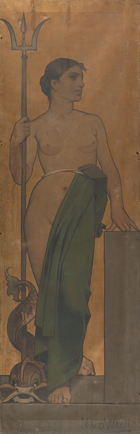 Rechthoekig doek met daarop afgebeeld een staande vrouwenfiguur, halfnaakt, met in de rechterhand een drietand.