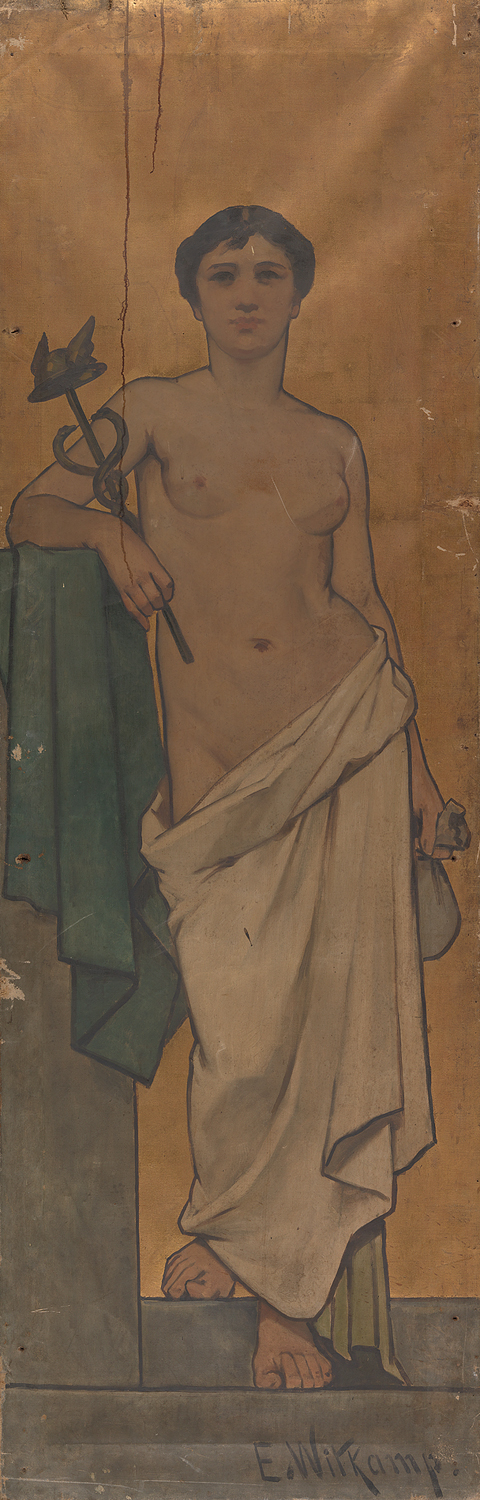 Rechthoekig doek met daarop afgebeeld een staande vrouwenfiguur, halfnaakt, met in de rechterhand een mercuriusstaf.