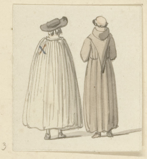 Dit zijn dezelfde figuren als op TA 18395.1, maar dan op de rug gezien. De karakteristieke driehoekige kap van de Capucijner pij is op de rugfiguur rechts te zien, net als een wapen op de rug van de man in het wit. Dit wapen, een rode en blauwe lijn die elkaar kruisen, duidt erop dat de man deel uitmaakt van de Orde van de Trinitariërs, een katholieke bedelorde.