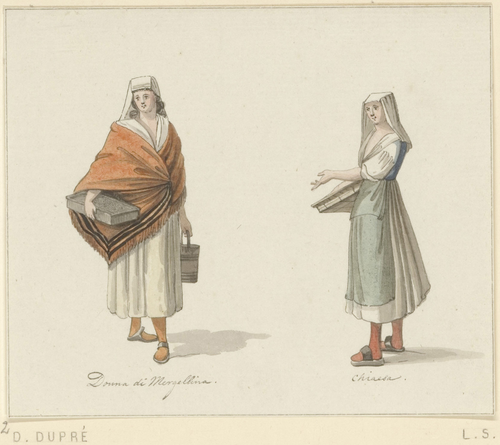 Deze twee figuren dragen geen kind. De linkervrouw is van voren afgebeeld, gehuld in een oranje sjaal en met een witte kap op het hoofd. Ze draagt in haar linkerhand een emmer en in haar rechter een schaal, die ze op haar heup laat leunen. De rechtervrouw, van links gezien, draagt een vergelijkbare kap op het hoofd, en een witte jurk met een groen schort. Ook zij laat een schaal op de heup balanceren. De onderschriften van deze twee luiden Donna di Mergellina en Chiaesa. Mergellina is vandaag de dag de naam voor het kustgedeelte van Napels, maar was tot 1880 een klein vissersdorp in de buurt van de grote stad; als de afgebeelde vrouw inderdaad uit Mergellina komt, zou haar emmer dus gevuld kunnen zijn met vis. Chiaesa betekent simpelweg kerk, maar aangezien de andere drie figuren duidelijk verbonden zijn met Napels en omgeving is het waarschijnlijk dat Dupré haar bijvoorbeeld heeft gezien bij een Napolitaanse kerk.
