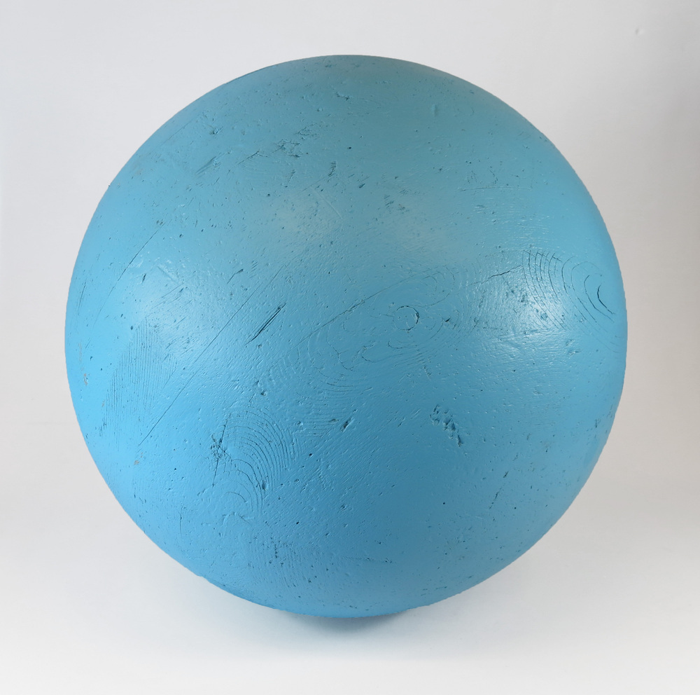 Blauw geverfde houten bal. t.b.v. evenwichtsact door circusacrobaten.- Trefwoorden