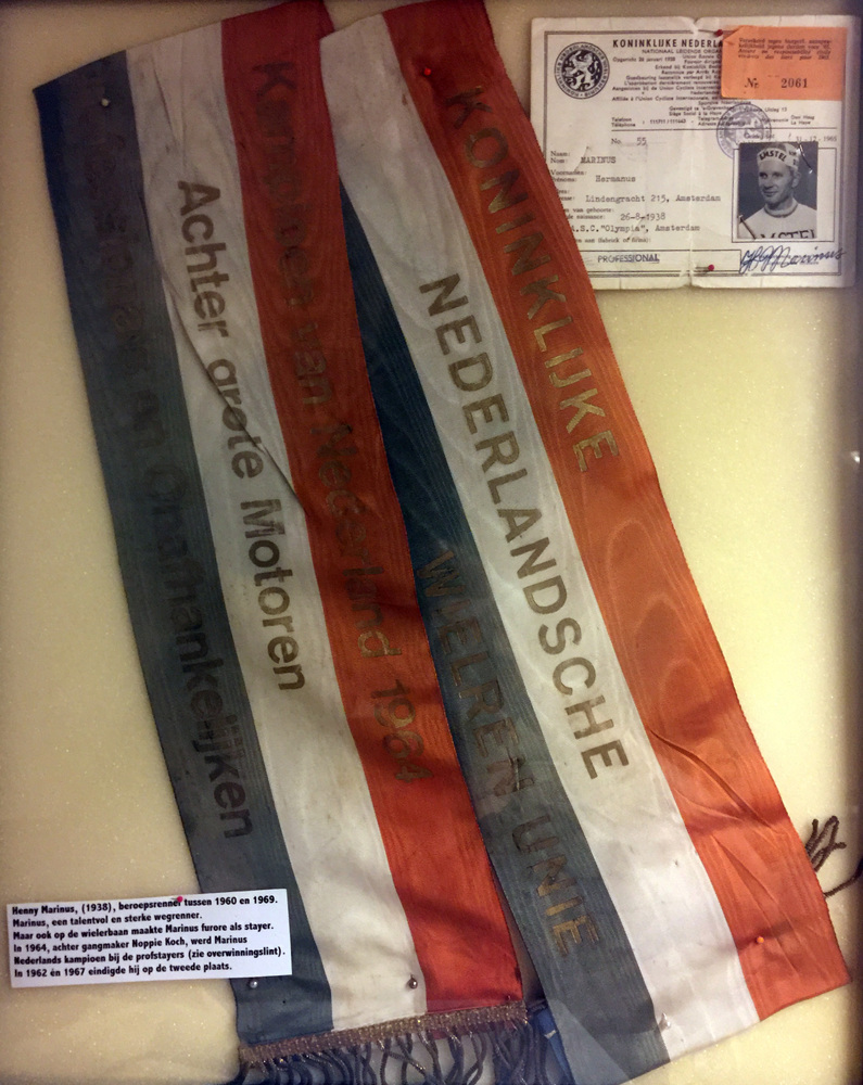 - Overwinningslint Kampioen van Nederland 1964 'achter grote motoren' en licentie van de Koninklijke Nederlandsche Wielren Unie van de Jordanese beroepswielrenner Henny Marinus (ingelijst), 1964
