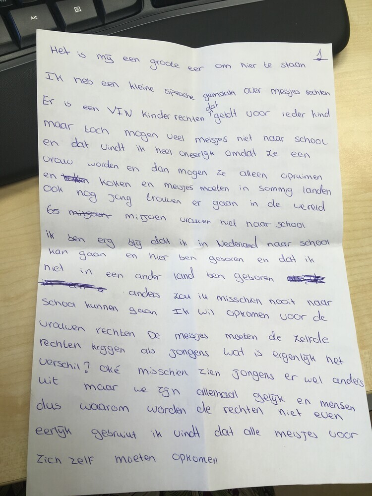 - Toespraak met betoog voor meer 'meisjesrechten', gericht aan burgemeester Femke Halsema, 2019