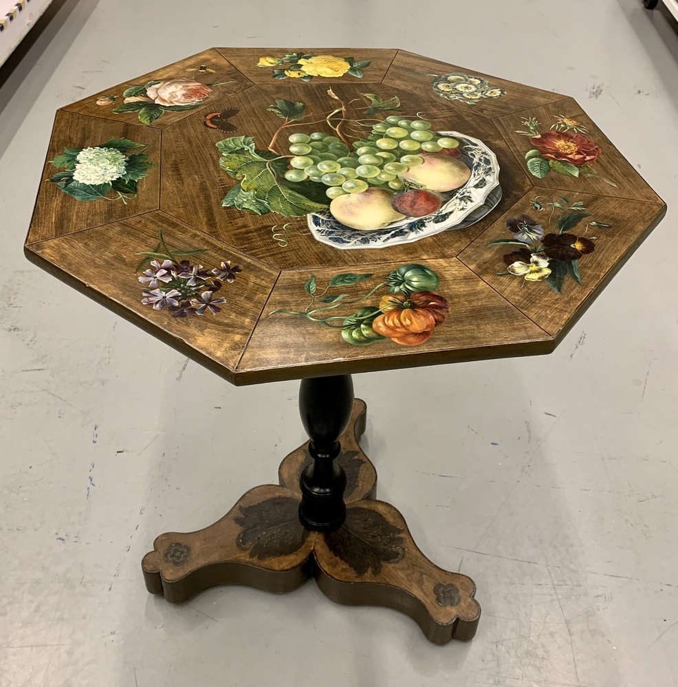 Mahoniehouten klaptafel, het ronde blad fijn beschilderd met een stilleven, staande op ronde schacht en drie sprant, Hollands Biedermeier.- Trefwoorden
