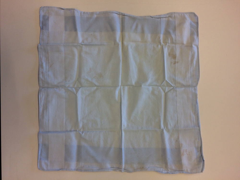 Zakdoek van lichtblauw katoen met langs de zoom ingeweven banen in satijnbinding. Vierkante zakdoek die in de broekzak van het driedelige herenkostuum zat.