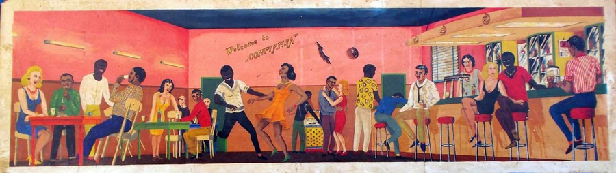 Dit vrolijke tafereel van café Confianza op het Kadijksplein, soms ook gespeld als Confiansa, werd begin jaren zeventig door een onbekende Afrikaan geschilderd, waarschijnlijk een zeeman die verbleef in het Zeemanshuis om de hoek van het plein. Het opschrift ‘Welcome to Confiansa’ maakt duidelijk waar we zijn. Het is een levendige scène in een kale met tl-balken verlichte kroeg, een dronken man aan de bar, een jukebox langs de kant met erboven een opgezette krokodil en een Afrikaans masker. Opmerkelijk zijn de vele gemengde stelletjes, zwarte man en witte vrouw, die dansen of aan de tafeltjes zitten. Misschien is het schilderij wel gemaakt om een barrekening te voldoen. De afmetingen zijn ongebruikelijk: 144,5 bij 42,5 cm. Het op karton geschilderde werk is enigszins aangetast en zeker geen meesterwerk. Maar voor het Amsterdam Museum is het een zeer welkome herinnering aan een deel van Amsterdam dat al in de jaren zeventig al behoorlijk kosmopolitisch was.