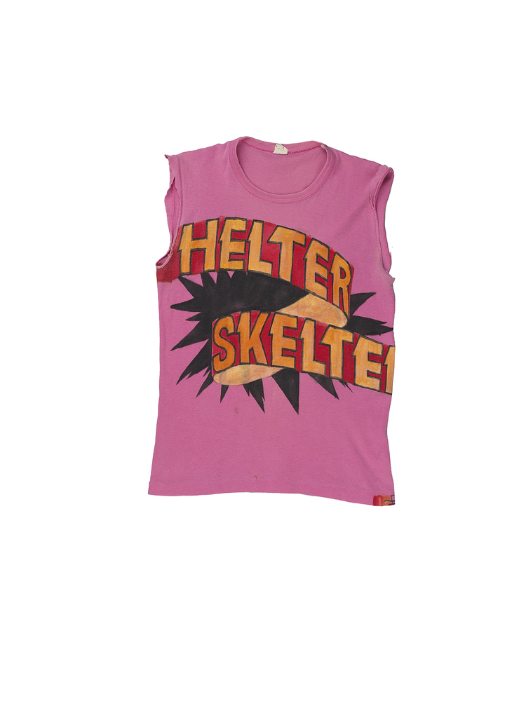 Opdruk vervaardigd door Mathilde muPe, tevens gedragen door Mathilde, zus van Diana Ozon. Helter Skelter was de bandnaam waar Mathilde muPe bas speelde.