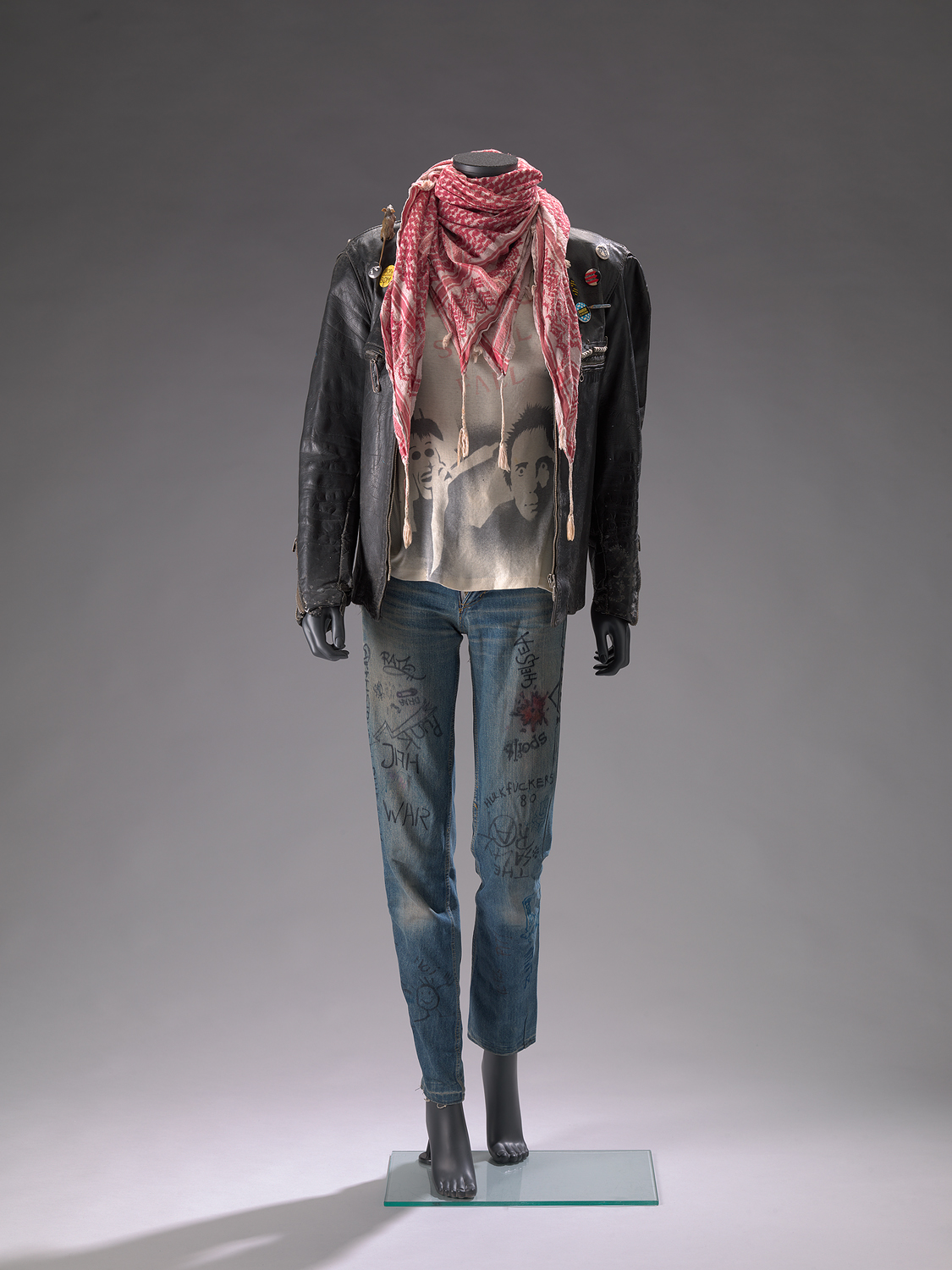 Zwart leren jack met metalen ritssluitingen voor, op de gepaspelleerde zakken en de mouwen. Typische punkbuttons met teksten en symbolen. Bij linkerborstzak strip met studs bevestigd met veilligheidsspelden. Daarboven speld van kroontjespen. Op de rechterschouder een ratje van kunststof als verwijzing naar Dr. Rat. Rechterborstzak sluit met veiligheidsspeld.