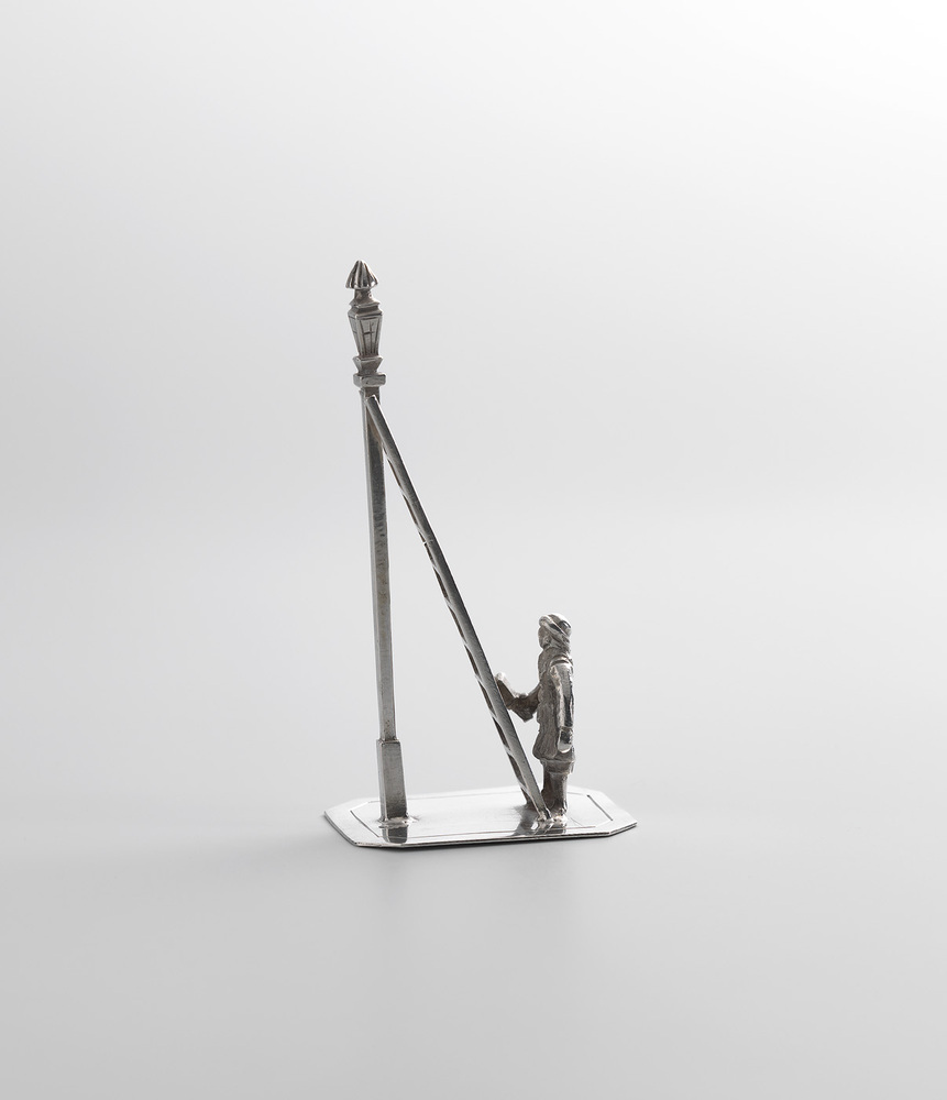 Vanaf de late zeventiende eeuw beschikte Amsterdam over openbare stadsverlichting met olielantaarns. De schilder-uitvinder Jan van der Heijden vond dit type straatlantaarn in 1663 uit. Een legertje lantaarnopstekers vulde dagelijks de reservoirs van de lantaarns bij en ontstak ze tegen zonsondergang. De opsteker in deze miniatuur is juist bezig zijn ladder tegen een mini Van der Heijden lantaarn aan te zetten. Realistisch is de inkeping bovenin de trap waardoor deze niet van de paal kan wegglijden. De man houdt een kleine lantaarn vast om zichzelf bij te lichten. ( Bert Vreeken)