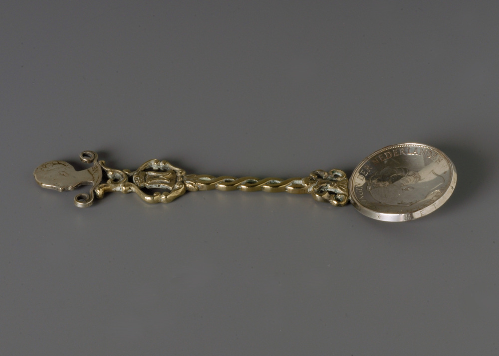 Theelepel waarvan de bak is gemaakt van een rijksdaalder, ofwel een knaak is F 2,50 en de kop eveneens vervaardigd van een dito knaak waarvan het silouette is uitgezaagd.- Trefwoorden