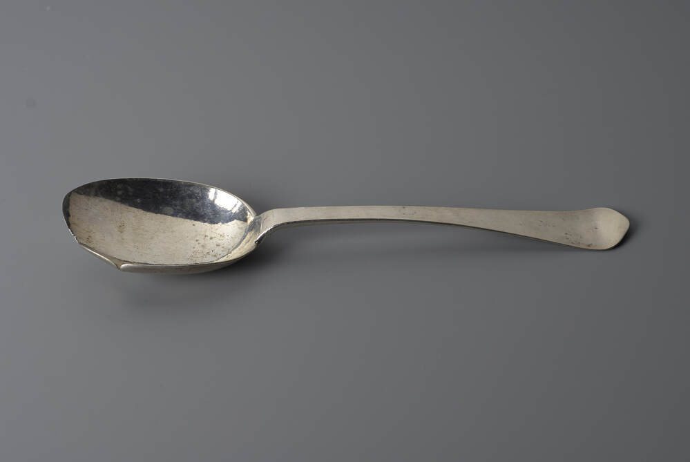 Lepel met platte steel met accoladevormige kop en ovale bak.- Trefwoorden