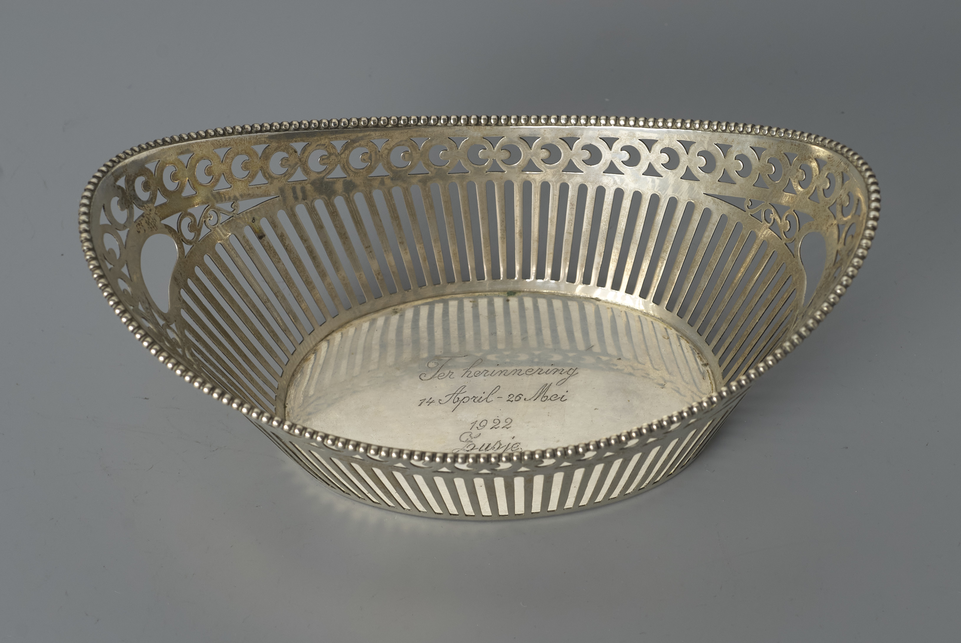 Spits ovaal mandje de wand ajour-gezaagd.- Trefwoorden