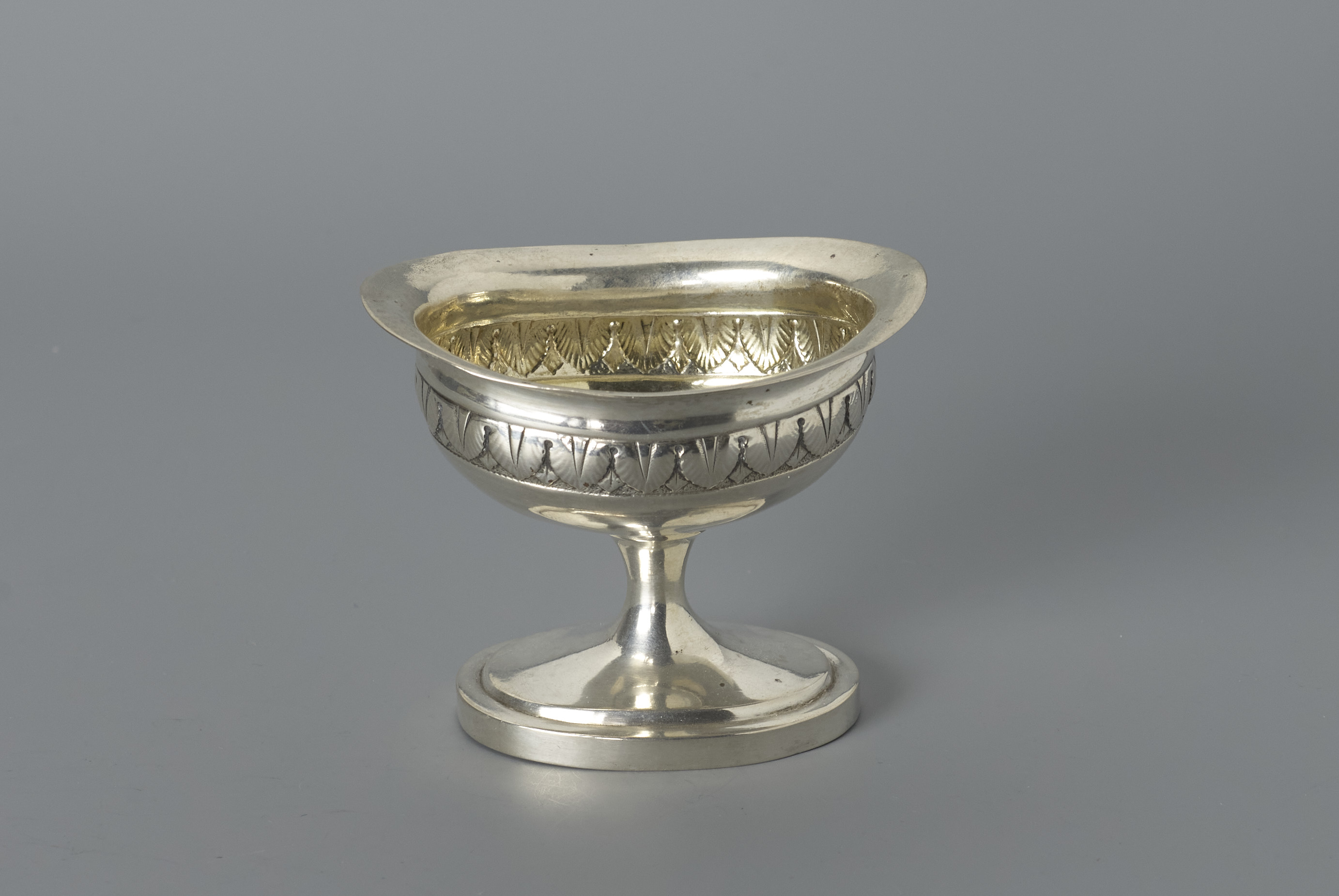Ovaal schaaltje met een gedrevenrand versiering op de wand, stand op een gladde ovale voet.- Trefwoorden