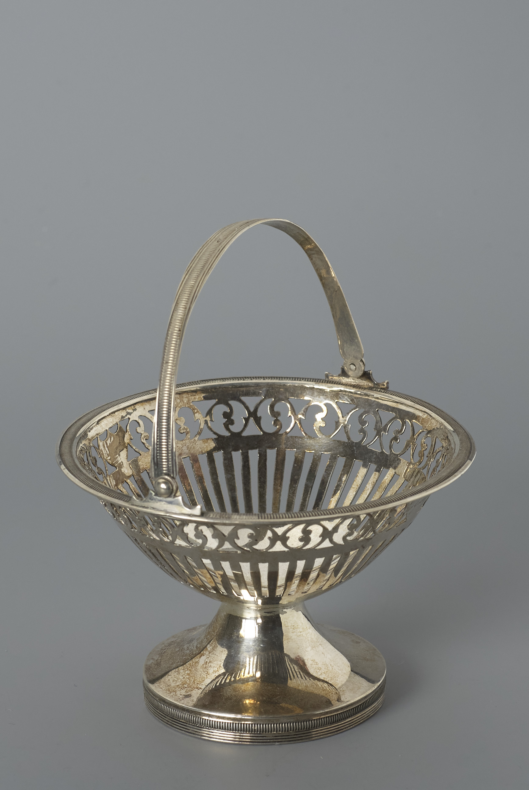 Rond ajour gezaagd mandje op ronde voet en geribd hengsel.- Trefwoorden