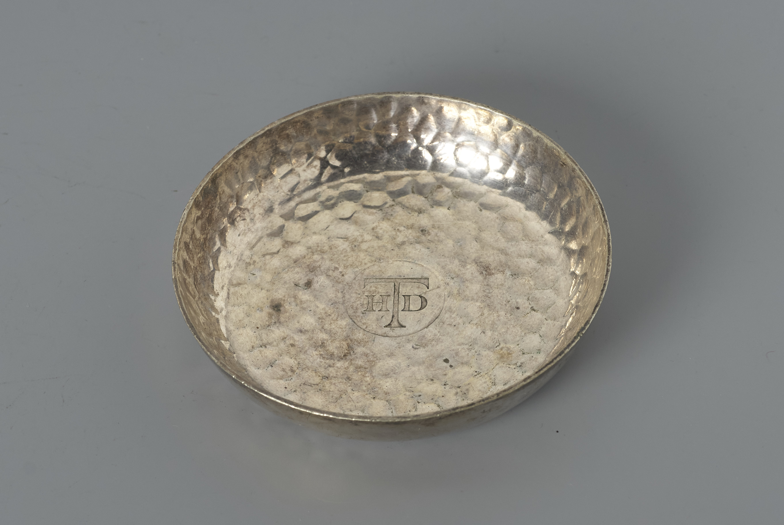 rond gegoten schaaltje binnenzijde, binnezijde met hamerslagdecor- Trefwoorden