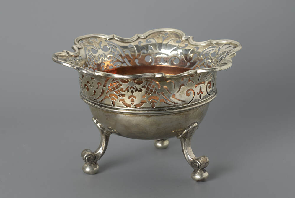 Ronde pijpenkomfoor op drie pootjes met gegolfde ajourrand en koperen binnenbak.- Trefwoorden