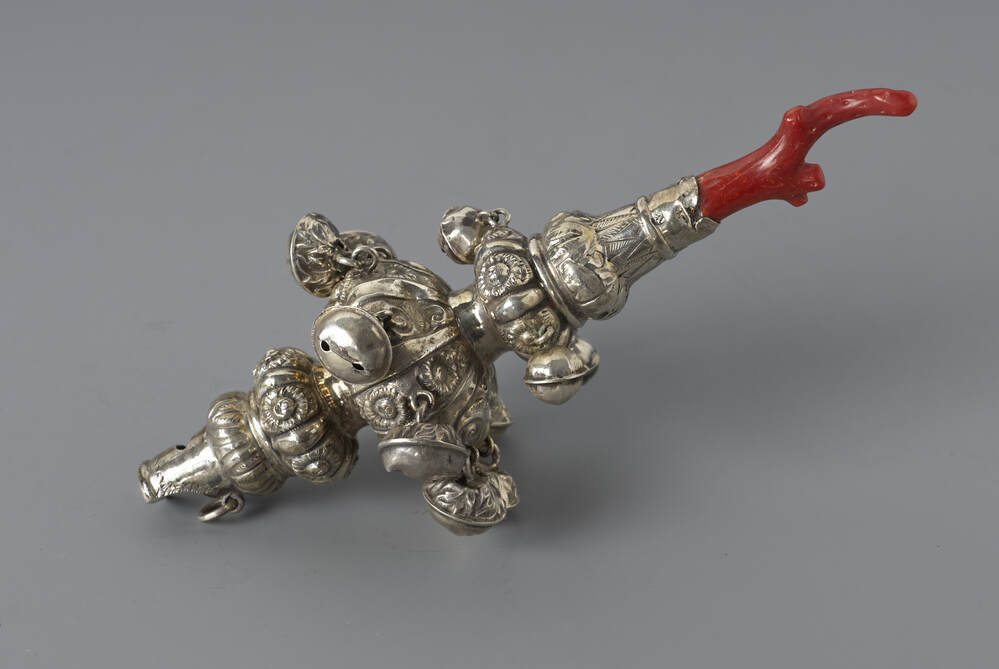 Rammelaar versierd met geometrische motieven, met elf bellen en een koralen bijtstuk