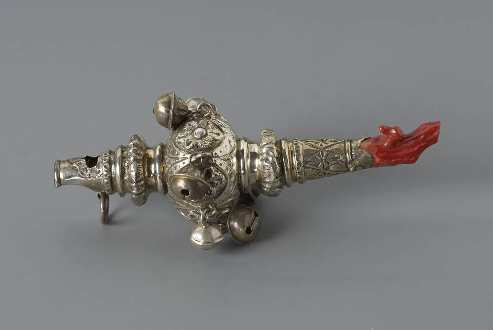Rammelaar versierd met geometrische motieven, met zeven bellen en een koralen bijtstuk- Trefwoorden