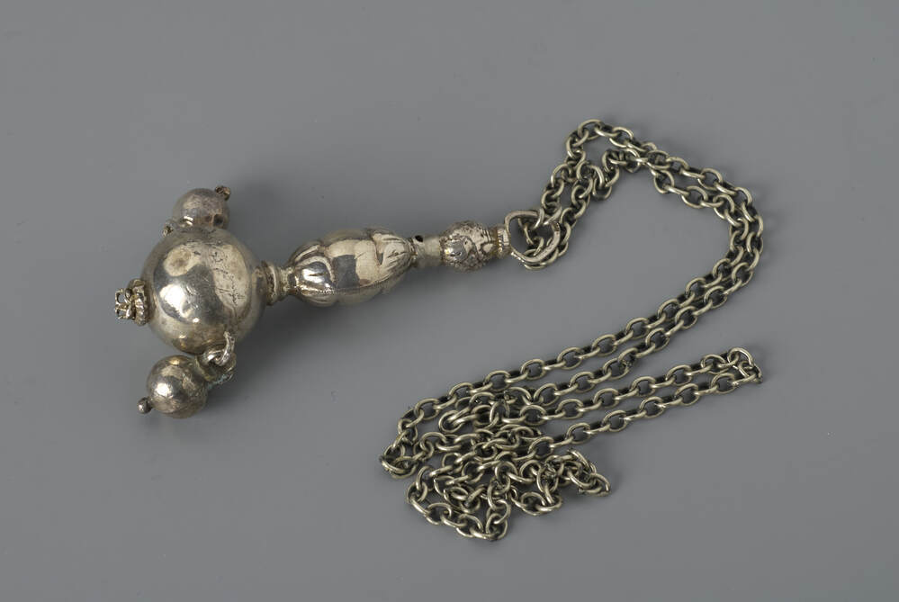 ketting van ovale schakels waaraan hanger met twee belletjes.- Trefwoorden