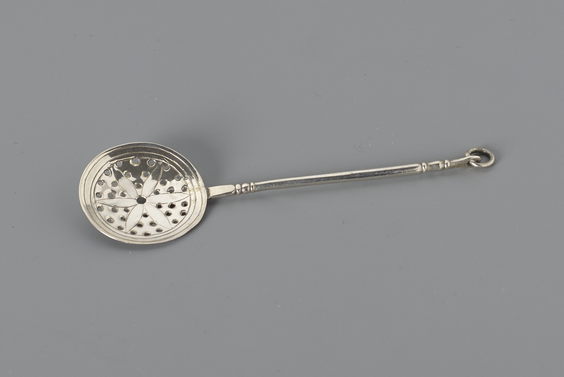 Lichtgewelfde ronde bak met gaatjes en gestileerde bloemblaadjes, lange geprofileerde steel met puntige aanzet en ophangoog.- Trefwoorden
