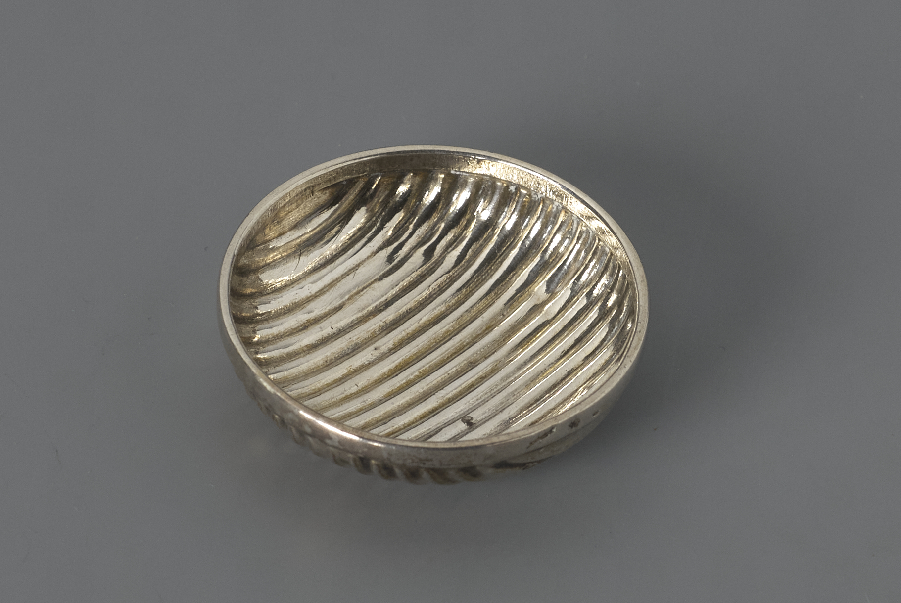 Ronde schaal met vlakke geribde bodem overlopend in de wand en met een gladde rand.- Trefwoorden